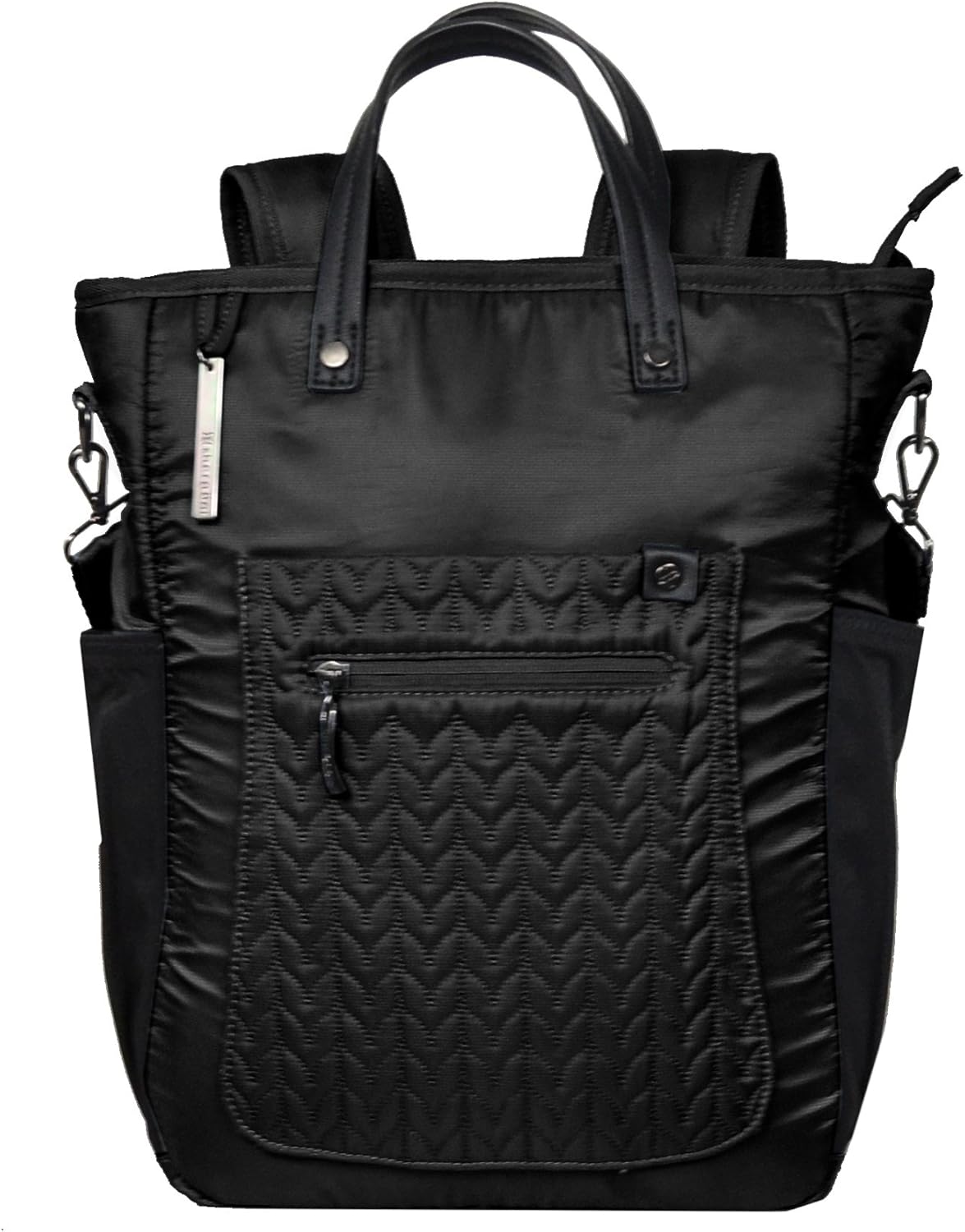 The Soleil is an all-in-one convertible backpack, tote, and crossbody bag. Features include padded backpack straps, RIFD protected front pocket, anti-theft zipper locks, and anti-slash mesh bottom.